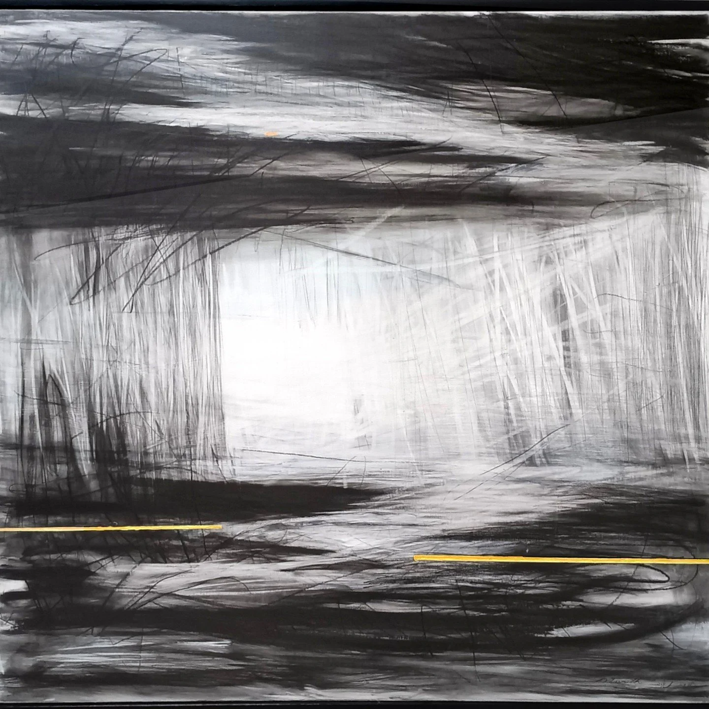 Måske står de sorte streger for vores daglige gerning, som skal bringe vores mening i livet frem. Både det hvide og det sorte er vigtige her – de er lige nødvendige. Det ene kan ikke eksistere uden det andet. Det kan lidt sammenlignes med en tekst, hvor de sorte bogstaver kun giver mening i kraft af de hvide mellemrum. Det handler om at finde balancen. De sorte streger bærer værket, skaber strukturen, men det er lyset, der opstår imellem dem, jeg leder efter. Det er dér, lyset bryder frem.
